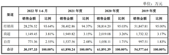 紫林醋业目前主要的销售渠道有经销商渠道、商超与自营渠道3个,其中经销商是公司主要的销售渠道,报告期内,经销商渠道销售收入占总营收的比重分别为95.00%、95.03%、94.37%、93.64%。2019年-2021年,紫林醋业累计计提销售返利金额近千万元。