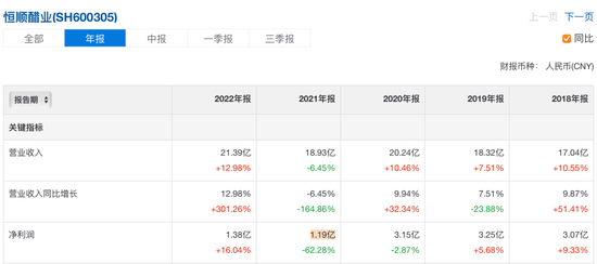 2019年-2022年6月,恒顺醋业分别实现营收18.32亿元、20.24亿元、18.93亿元、11.83亿元;净利润3.25亿元、3.15亿元,1.19亿元,1.28亿元。