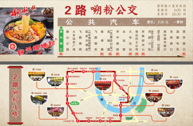 目前,柳州恒达巴士公司已经完成设计并制作“螺蛳粉公交专线”“嗍粉公交线路”车辆螺蛳粉广告元素,重新设计制作2路、92路的线路牌样式,突出螺蛳粉元素,标明沿线网红螺蛳粉店的名称。同时在柳州火车站和龙城路公交站台,设置线路走向图,便于乘客了解沿线螺蛳粉店的分布点,方便“嗍粉”客人选择下车站点。根据全市网红螺蛳粉店的地理分布,编制“嗍粉”公交攻略,同步与2路和92路一并进行对外宣传。同时,结合支付宝新人免费乘车活动,联动“支付宝”平台“嗍粉公交”沿线合作商家投放满减优惠券,吸引商家顾客搭乘公交出行。