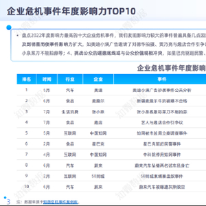 回顾2022年全年中国企业危机舆情,一句话概括就是作死的多,犯事儿的少。在企业危机事件年度影响力TOP10事件中,我们看到了最不想看到的现象:营销、监管、企业文化、造谣中伤等非产品或生产风险的危机舆情竟然占比达到50%!而全年影响力指数最高的企业危机事件就是奥迪小满广告抄袭事件!