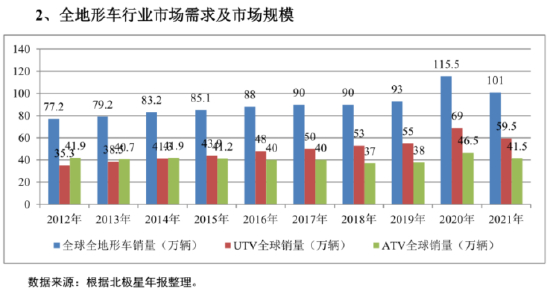 随着生活方式的变化以及收入水平的不断提高,全地形车逐步向娱乐性、实用性方向发展。根据全球市场洞察公司(Global MarketInsights)发布的研究数据,2018年全地形车(ATV)市场规模超过25亿美元,预计至2025年,全球全地形车(ATV)市场规模将超过33亿美元;2018年全地形车(UTV)市场规模超过60亿美元,预计从2019年到2025年的年复合增长率将达到5%。