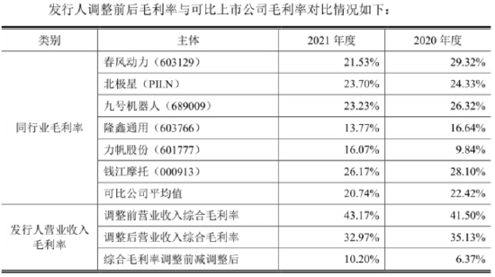 受益于较高的核心部件自制率和对上游较强的议价能力,涛涛车业2019年-2021年综合毛利率分别为42.51%、35.13%、32.97%,其中2020年、2021年较可比公司均值高出10多个百分点。