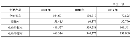 2019年至2021年,公司全地形车销量的复合增长率达到了45.43%、摩托车销量的复合增长率达到了16.64%、电动滑板车销量的复合增长率达到了111.38%、电动平衡车销量的复合增长率达到了88.02%。