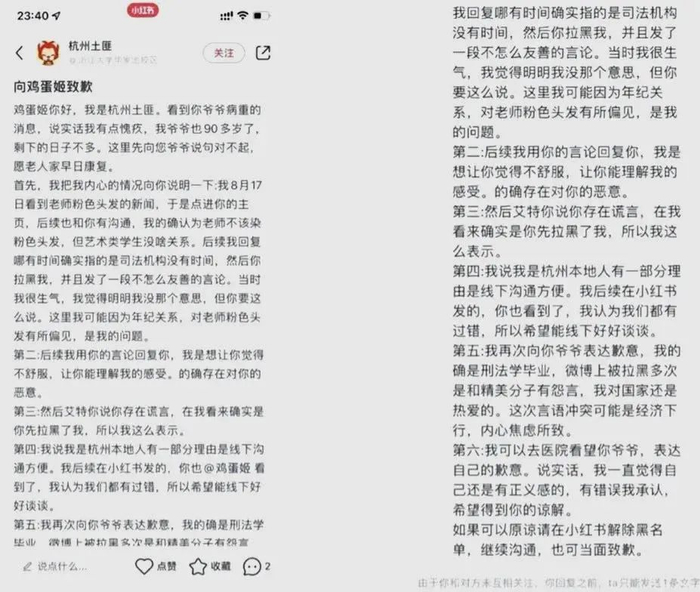 @杭州土匪向“鸡蛋姬”致歉。