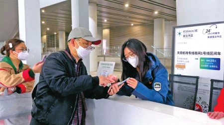 天府国际机场机场专线上车点排队买票的乘客。
