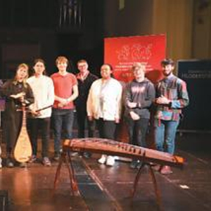 二〇二二年十一月,嘉音琴社老师于英国哈德斯菲尔德大学教当地学生民乐弹奏。受访者供图