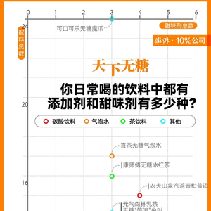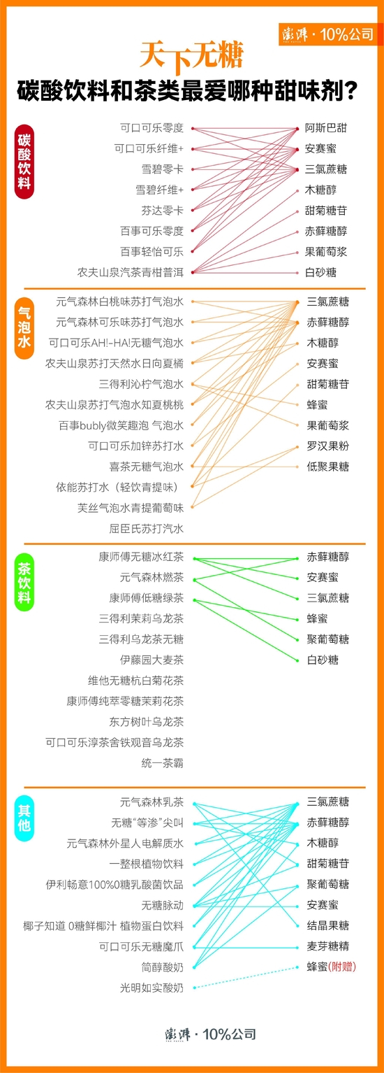 百事、可口可乐两大巨头几乎占领了“无糖”碳酸饮料市场,大多将“0糖”“0脂肪”“0能量”作为卖点。以元气森林苏打气泡水为代表的气泡水饮品,则强调“0卡糖”“0卡路里”。三得利茉莉乌龙茶、东方树叶乌龙茶等茶饮料,几乎都没有添加甜味剂,主打“无糖”概念,而像康师傅无糖冰红茶添加了多种甜味剂。简醇酸奶等其他饮品,则一般标注“无蔗糖”“0乳糖”等。