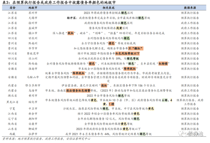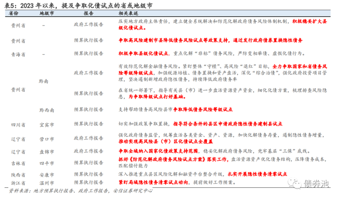 ②关注化债试点的扩容。我们在2023年1月29日发布的报告《从148个地级市政府工作报告看隐债化解进展》中做过提示,2023年可重点关注化债试点配合特殊再融资债的发行情况。随后贵州预算执行报告提出“通过发行政府债券置换隐性债务”。从192个地级市预算执行报告来看,贵州、四川、吉林、陕西、浙江等部分地级市均提及化债试点相关内容。2023年关注两个方向,无隐债试点在“好区域”的推广和化债试点在“尾部区域”的扩围。