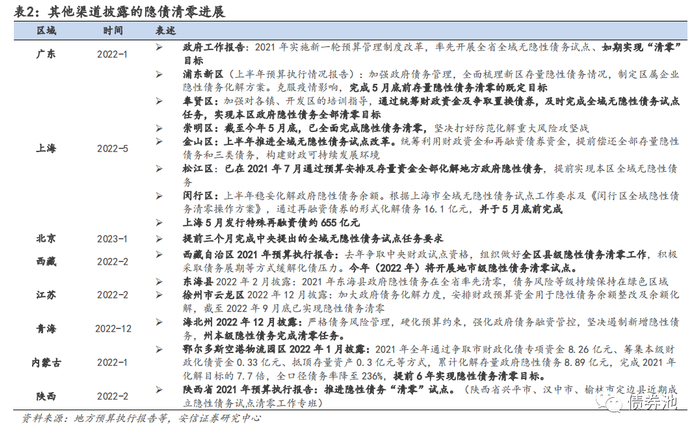 目前全国“隐债清零”工作有三大特点。(1)三个“全域无债试点”省市基本完成清零。广东和北京分别于2022年1月、2023年1月“官宣”清零,上海根据各区的信息披露,或在2022年5月前后完成清零。(2)非试点省市“散点”推进。目前有湖南(部分区)、湖北(村级)、内蒙古(部分旗区)、江苏(部分县区)、青海(部分州)等省份的部分区域涉及“隐债清零”。(3)以“自下而上”推进为主。非试点省市“隐债清零”从债务存量较小的村级或区县切入居多,如湖北较多地级市涉及村级债务清零,湖南、江苏、内蒙古等清零主要涉及个别区县。除北上广外,“自上而下”的推进并配合中央政策资金支持目前尚未进一步推开,2023年可密切关注相关政策动向。例如,温州在预算执行报告中提出,“紧盯局域隐性债务清零试点动向,提前做好工作预案”。