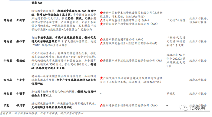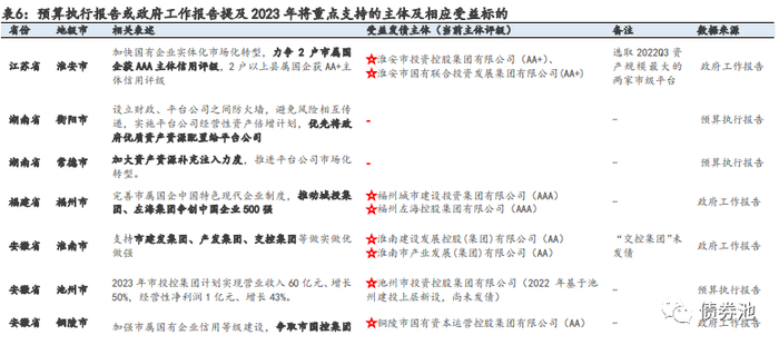 ③关注有资产注入或评级提升计划的主体。如常德提出“加大资产资源补充注入力度”,开封提出“努力打造1家 AAA、4家 AA+的高信用评级企业集群”,池州提出“2023年市投控集团计划实现营业收入60亿元、增长50%”等。