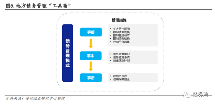 (1)事前:在债务产生以前,通过扩大债务管控范围、限制债务规模、限制融资成本、限制债务结构、管控平台数量等,防患于未然。