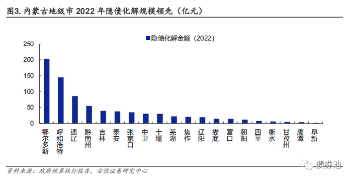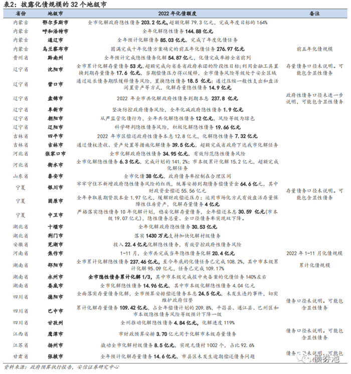 ■二、32个地级市披露化债规模。分布在内蒙古、贵州、辽宁、吉林、河北等省份。煤价上涨带来区域财力改善的背景下,内蒙古化债规模遥遥领先,3个披露数据的地市2022年隐债化解规模均在百亿左右,贵州和辽宁部分地级市披露化债规模也较高。