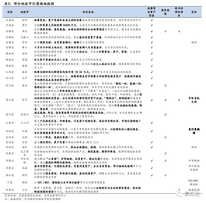 (3)转为经营性债务。少数地级市涉及“隐转企”化债,如淮北提出“采取预算安排、债务展期、合理合规转换为企业经营债务等多种方式,稳妥有序化解存量隐性债务”;兰州提出“综合运用合规转化为企业经营性债务、依法依规核减隐性债务等方式,稳妥有序化解存量隐性债务”。