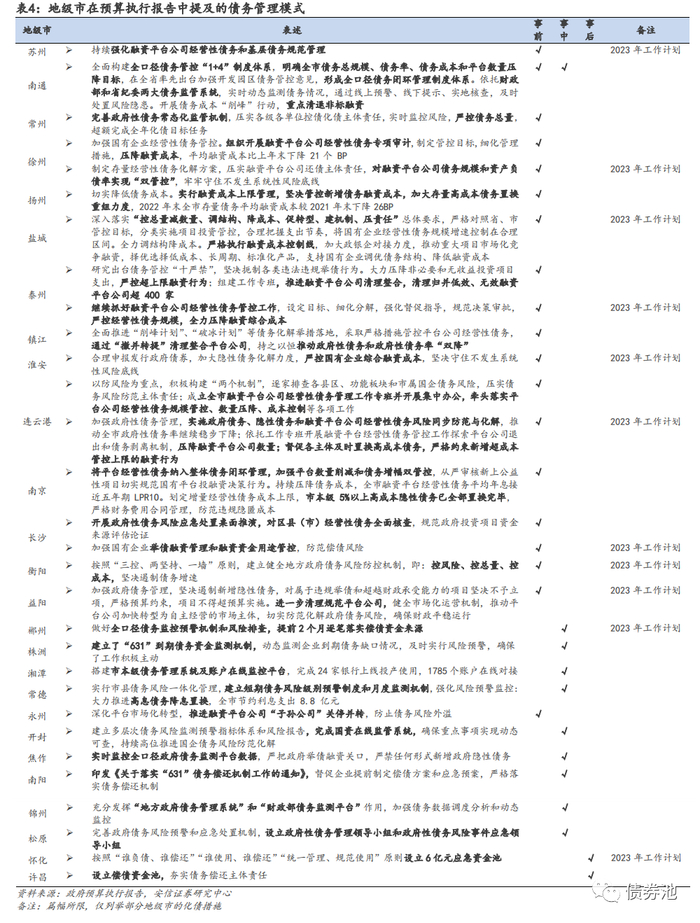 ■六、3类债务管理措施多管齐下。①事前:通过扩大债务管控范围、限制债务规模、限制融资成本、限制债务结构、管控平台数量等,防患于未然。以江苏较为典型,多数地级市在隐债之外,强调“经营性债务”管控,提出债务规模、债务率、债务成本、债务结构、平台数量管控目标。②事中:通过债务监管组织(如债管办)、债务监测系统(财政部、纪委、国资委、企业债务管控系统)、制定还款计划(如631偿债机制)等管控债务风险。③事后:若债务出现兑付困难,通过应急资金池、信用保障基金等避免偿债风险。如怀化设立6亿元应急资金池,许昌设立偿债资金池。