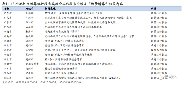 ■四、15个地级市涉及“隐债清零”。分布在广东、湖南、湖北、内蒙古、江苏、陕西等省份。目前全国“隐债清零”工作有三个特点,①三个“全域无隐债试点”省市基本完成清零;②非试点省市“散点”推进;③非试点省市“自下而上”推进为主,从债务存量较小的村级或区县切入居多。