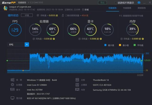 《英雄联盟》大家也都知道,对于显卡要求不高,全程平均帧率129,处理器和显卡负载都很低,很轻松。