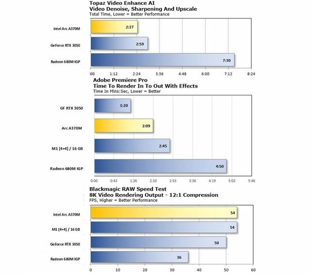 众所周知,游戏主要看显卡表现,雷神T-BOOK 14所搭载的是英特尔A370M独显,相信大家对于其性能并不是那么了解,通过国外某知名网站的一组对比数据来大概了解A370M的性能,下面图中包含了AI视频降噪、Adobe PR及8K视频渲染三项生产力测试,结果如下: