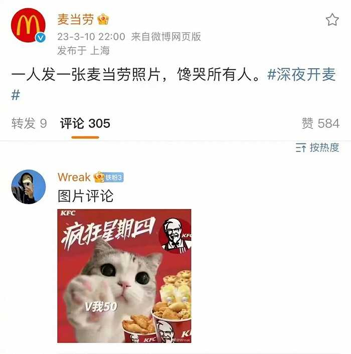 除了前两类忠实跟随的麦门信徒之外,近期最让麦当劳出圈的,更要归功于这类“教籍”难辨的一众粉丝们。他们常会活跃于和麦当劳官方的互动中,但却总是用其他帮派吸引麦当劳的注意,比如说肯德基。