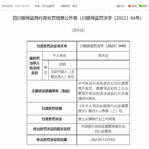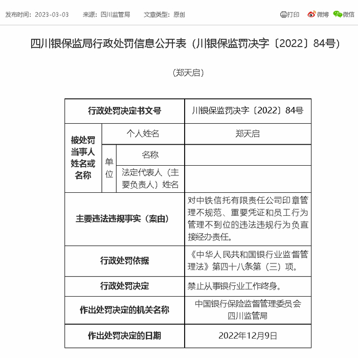 日前,银保监会官网披露川银保监罚决字〔2022〕84 号处罚信息表显示,郑某启因对中铁信托有限责任公司印章管理不规范、重要凭证和员工行为管理不到位的违法违规行为负直接经办责任,四川银保监局依据《中华人民共和国银行业监督管理法》第四十八条第 ( 三 ) 项,对其处以禁止从事银行业工作终身处罚。上述处罚决定日期为:2022年12月9日。