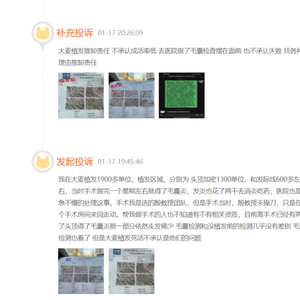 另一位消费者投诉称,自己在大麦微针植发做完手术后一星期左右就得了毛囊炎,院方处理态度不紧不慢。手术过程当中,自己选择的主治医生团队并未操刀,也不确定做手术的医护人员是否具备相关资质。距自己做完植发手术已经过去两年的时间,而自己患毛囊炎的那一部分头皮依然头发稀少,毛囊检测和没植发前几乎没有差别,大麦植发方推卸责任,不承认植发成活率低。