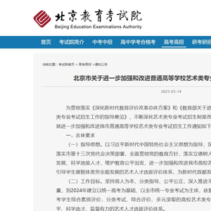 北京教育考试院14日发布通知,到2024年全面实施音乐、舞蹈、表(导)演、播音与主持、美术与设计、书法等6个艺术类专业全市统一专业考试。