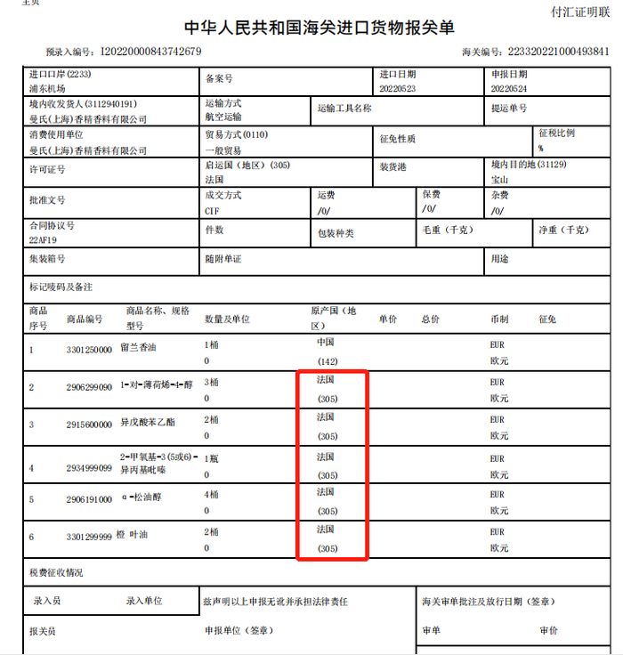 下面是香料进口的单据,从原料上追求高品质⬇️