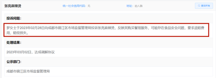 记者在“四川消费投诉信息公示平台”上看到,川内关于张亮麻辣烫最近的一次投诉时间在上月。梦女士于2023年2月28日向成都市锦江区市场监督管理局投诉张亮麻辣烫,反映其购买餐馆服务,可能存在食品安全问题,要求退赔费用,赔偿损失。处理结果:2023年3月2日,达成调解协议。