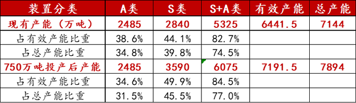 当前S类和A类装置已逐渐成为市场的主流装置,两者总产能已占有效产能的82.7%。尤其S类装置占比正在显著提升,当前S类装置产能占有效产能44.1%,但上半年750万吨S类装置投产后,S类装置产能将占有效产能的49.9%,S类+A类产能也将提升至有效产能的84.5%。届时B类、C类和D类装置只占15%左右,因此2023年应以S类和A类装置加工成本为主要考虑,以此来定义PTA加工费的上下边际。