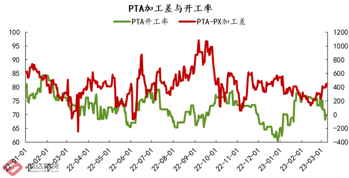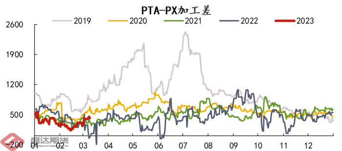 (1)当PTA-PX加工差持续1-2周低于250元/吨以下时,装置陷入全面亏损,后续大概率会有装置停车检修。如下图所示,2023年2月7日-2月20日,PTA加工差连续两周低于250元/吨,最低跌至135元/吨,随后2月底多套装置公布检修或降负计划,以减少供应,抬升价格修复加工差。截至3月10日,PTA加工差已修复至400元/吨以上。