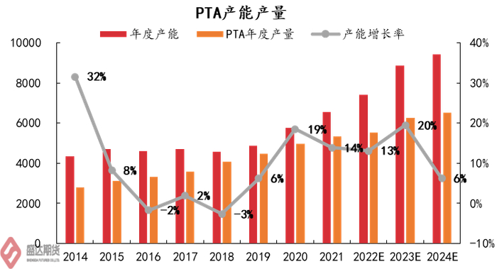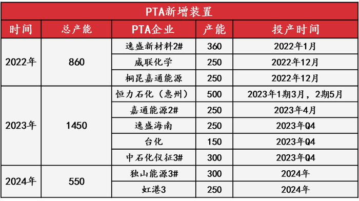 自2019年底开始,本轮PTA大投产周期开启,3年以来PTA产能增长率始终在10%以上,且新投产的均为200万吨以上的先进装置,行业平均加工成本明显降低,加工费长期处于偏低水平,过剩产能淘汰明显加速。2023年又是PTA大投产的一年,年度新产能或达1450万吨,产能增长率达20%。