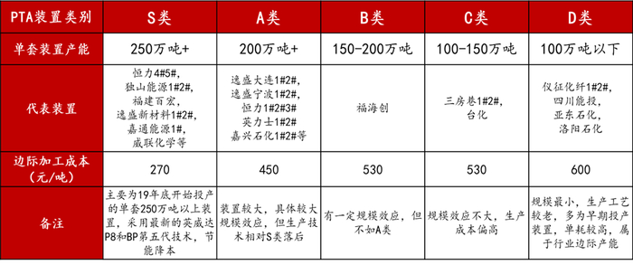 随着近几年的大投产,高加工成本的C类和D类装置大部分已经淘汰,现有C类和D类少量装置仍存的原因主要是其有相应配套的下游,如仪征化纤和三房巷等。且其装置投产较早,折旧摊销等费用早已计提完毕,原料成本能够覆盖即可维持开工。