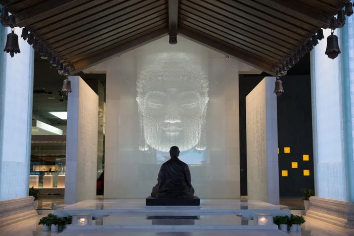 例如,南京的大报恩寺,近年有不少新操作,运用光影构造和科技设计冲击着游客的视觉体验。其内部有一个由光纤条和8000多个水晶珠子组成的3D立体佛首,被称为“赛博朋克佛像”,科技感拉满。