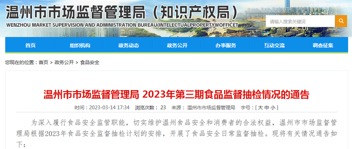中国质量新闻网讯 近日,浙江省温州市市场监督管理局发布2023年第三期食品监督抽检情况的通告。