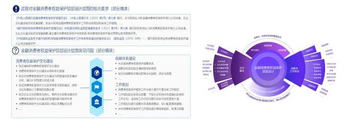 二是在各消费者权益保护管理领域体系化建设的基础上,进一步关注消费者权益保护与业务场景的融合,统一各消费者权益保护管理领域中各类业务、各类管理场景的管理语言,形成标准化消费者权益保护管理工具库,包括统一的问题词条库、检查要点库等,协助消费者权益保护工作标准、有效的开展。