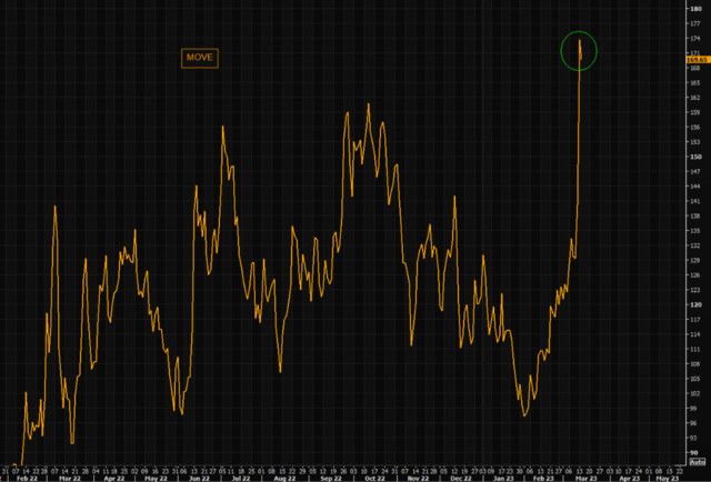 数据显示,衡量美债隐含波动性的指标——洲际交易所美国银行 MOVE 指数,本周飙升至2009年金融危机以来的最高水平。虽然美国监管机构迅速采取了行动,为硅谷银行的存款提供担保,但分析师仍对进一步的波动保持警惕。