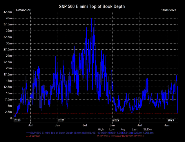 高盛分析师 Scott Rubner 指出,虽然股指期货的交易量巨大,但流动性非常糟糕。标普500指数期货的流动性规模仅为200万美元,这是自2020年3月30日以来的最低水平。