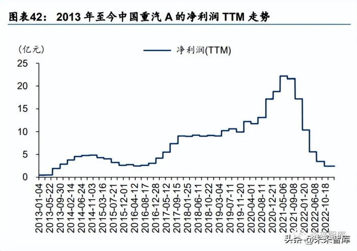 2022 年 9 月重汽 A 的 PE 已到最高盈利下的估值底,有较高的风险收益比。我们复盘重汽 A 的股价触达高点后的走势,过去 5 年公司股价整体可分为 4 轮行情,分别为 2017 年 8 月 到 2018 年 10 月,2019 年 4 月到 2019 年 12 月,2020 年 4 月到 2020 年 12 月,2021 年 1 月至今。我们观察到,每阶段重汽 A 的盈利高点对应的 PE 存在着底部支撑,其 PE 的底 部在 8-10 倍左右。2022 年 9 月,重汽 A 市值对应上轮周期利润高点的 PE 近 7 倍,处于 最高盈利下的估值底,2023 年 1 月,重汽 A 市值对应上轮周期利润高点的 PE 为 10 倍左 右,虽然估值略有提升,但我们认为该估值水平仍有较高的风险收益比。