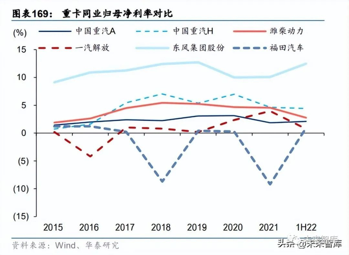 2022 年或为重卡业绩底,静待行情回暖释放利润弹性。在多因素压制下重卡企业的净利率 与 ROE 持 续 下 滑 , 1H22 潍 柴 动 力 / 中 国 重 汽 -H/ 一 汽 解 放 净 利 率 分 别 同 比-3.13ppt/-0.76ppt/-3.42ppt,ROE 分别同比-7.38ppt/-7.18ppt/-12.36ppt,已达到 15 年以来 的较低水平。短期看,当前疫情防控调整优化存在经营扰动且 22 年业绩未完全兑现,盈利 或有所承压,但往后看,我们认为重卡行业需求侧回暖较为清晰、产能逐步出清、库存状 态良好,有望盈利向上、向下空间不大,侧面反映 2022 年大概率为业绩底。