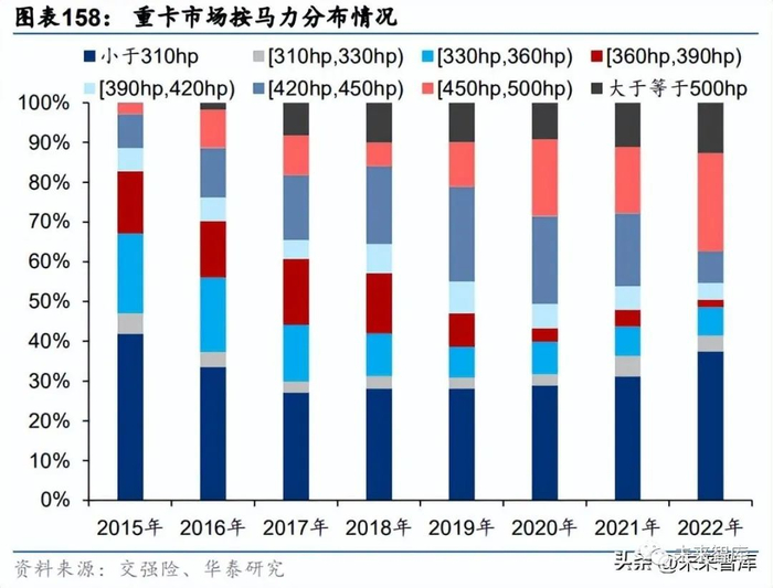 大排量和大马力成为重卡产品主流发展方向。从排量上看,10L 以上重卡市场占比由 15 年 的 33.6%提升到 22 年的 44.5%,而 8-10L 市场份额缩减明显,由 15 年的 29.3%缩减到 22 年的 5.8%,同时排量大于 13L 的产品不断推出,22 年占比由 21 年的 1%提升到 4.3%。从 马力上看,450 马力以上重卡的占比由 15 年的 2.7%提升至 22 年的 37.3%,同时小马力重 卡的占比较为稳定。我们认为大马力大排量发展趋势不可避免,国六阶段下后处理 DPF 的 排气压力较大,会损耗掉部分动力,要求马力有相应提高来弥补损失,22 年各企业加大大 马力产品的投放,450 马力以上重卡的占比在行业低迷下同比增加了 8pct。