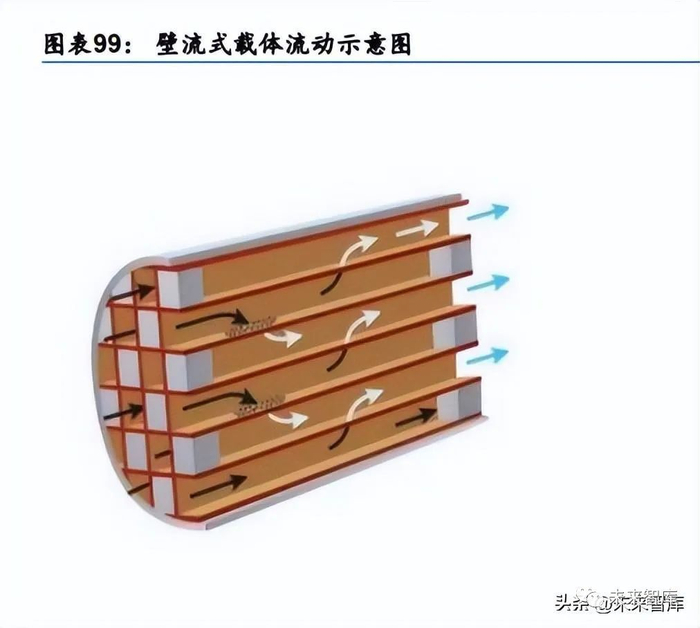 市场拆分:陶瓷载体和催化剂为产业链主要环节 。尾气处理用陶瓷载体可分为直流式载体和壁流式载体。直流式载体主要用作 DOC、SCR 和 TWC 载体,提供有效表面积及适宜的孔结构,让催化剂可以充分散布于载体表面积,提 高催化效率。壁流式载体用作柴油颗粒捕集器(DPF)和汽油颗粒捕集器(GPF)。它具有 超过 90%的吸附率以及良好的机械和热耐久性。