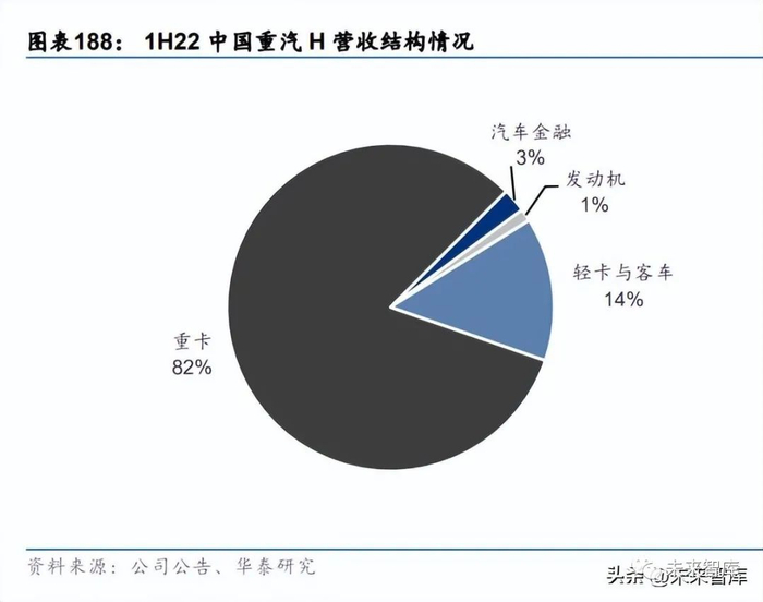 公司的主要收入来自重卡业务。公司业务按产品类型可分为 4 个分部,重卡分部包括汕德 卡、豪沃、豪瀚、斯太尔、黄河等品牌,福建海西汽车、成都王牌商用车、济宁商用车、 济南商用车、重汽济南卡车等整车分部均涉及重卡业务,公司主要生产基地位于济南;轻 卡与客车分部包括豪沃、豪曼、王牌等品牌,生产基地分别位于济南、福建、成都;发动 机分部的大部分生产为满足公司自身需要;金融分部主要向集团成员公司和用户提供汽车 金融服务。重卡业务为公司的主要收入来源,营收占比保持在 80%左右,1H22 营收占比达 82%。
