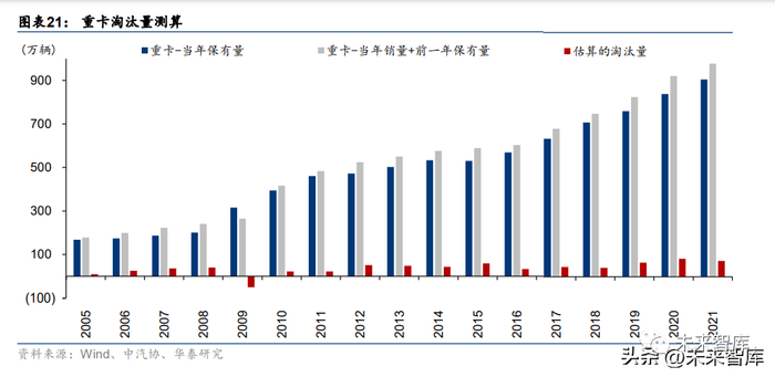 预计总量膨胀带动需求高增的阶段已结束。我们以“公路货运周转量/物流中重卡保有量” 衡量单车运力,并根据支线治超与疫情的前后阶段,对比了 2015 年与 2018 年、2015 年与 2021 年的物流中重卡保有量增速和公路货物周转量增速。数据显示,单车运力大幅下降会 释放相应的增购换购需求,带动物流中重卡保有量的增速提高,同时保有量的增速均超过 了公路货物周转量的增速,这一差距在 2021 年更为显著,我们认为主要系 2020 年复工复 产后各地治超政策频出加快了治超进度,导致单车运力大幅下滑,释放了较多的物流中重 卡需求。我们认为,一方面在 2020 年治超政策推进后,单车运力进一步下探的可能性不大, 2021 年已出现小幅度反弹,一方面物流中重卡保有量增速已显著超过下游需求增速,综合 来看,治超治限导致的物流类公路货运运力缺口已基本填补。