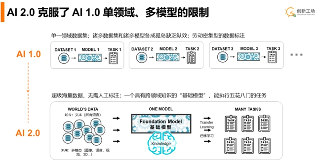 而AI 2.0 的巨大跃迁在于克服了前者单领域、多模型的限制,可以用无需人工标注的超级海量数据去训练一个具有跨领域知识的基础大模型(Foundation Model),通过微调等方式适配和执行五花八门的任务,真正有望实现平台化的效应,进而探索商业化的应用创新机会。