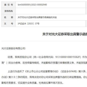 上述行为违反了《非上市公众公司监督管理办法》(证监会令96号)第六条、第五十四条的规定,根据《非上市公众公司监督管理办法》第六十二条的规定,上海监管局决定对光大证券采取出具警示函的行政监管措施。光大证券应举一反三,完善持续督导工作的管理机制,落实勤勉尽责要求,切实提升业务质量,杜绝类似事件再次发生。