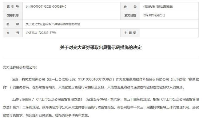 近日,中国证监会上海监管局发布了关于对光大证券(601788)采取出具警示函措施的决定。上海监管局发现光大证券作为北京赢鼎教育科技股份有限公司(以下简称“赢鼎教育”)的主办券商,在持续督导期间,未能勤勉尽责履行审慎核查义务,未能发现赢鼎教育通过虚构业务虚增业务收入的情形。