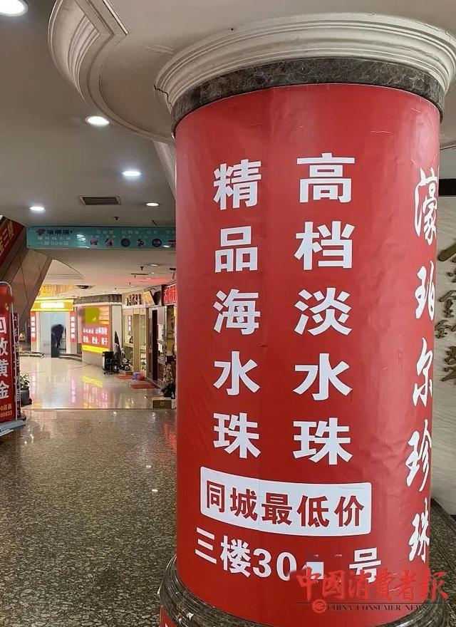 在特艺城一楼,两个大立柱上贴着非常醒目的广告“濠珀尔珍珠高档淡水珠、精品海水珠同城最低价三楼3041号”。执法人员找到该门店指出,《广告法》规定不得使用“国家级”“最高级“”最佳”等用语,责令其立即整改。