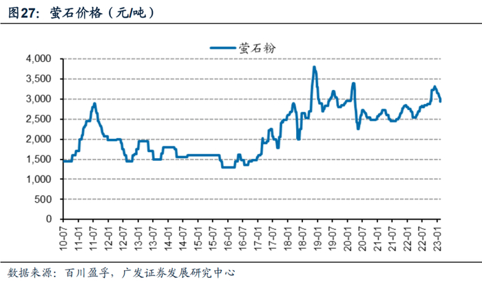 萤石价格中枢上行。需求端制冷剂产品迭代提振传统板块需求,供给端中国萤石开采监管逐渐规范化、严格化。根据百川数据,2010年至今,萤石粉均价为2206元。吨,2017年后,萤石价格中枢上行,2018-2022年萤石粉均价分别为2744、2932、2703、2609、2842元/吨,2023年至今均价为3057元/吨,相较历史均价明显提升。