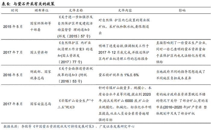 随着中国经济转型升级战略的实施,国家持续对资源进行合理开发,与萤石开采密切相关的安全生产、税收以及生态环境保护等方面的政策逐渐出台,萤石开采监管逐渐规范化、严格化。为规范萤石行业发展,工信部等七部委于2010年出台了《萤石行业准入标准》,用于治理企业“小、散、乱”的局面。但仍然存在部分企业偷挖乱采、破坏环境。后续多项政策的出台有助于淘汰不合标准的中小型企业,使资源向符合标准的头部企业集中,实现资源开发与环境保护的平衡。