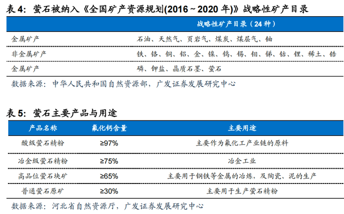 萤石又称氟石,是CaF2的结晶体,广泛应用于化工、冶金、建材等行业。为保障国家经济安全、国防安全和战略性新兴产业发展需求,萤石已被纳入《全国矿产资源规划(2016~2020年)》战略性矿产目录,作为矿产资源宏观调控和管理的重点对象。萤石主要可分为四类产品:酸级萤石精粉、冶金级萤石精粉、高品位萤石块矿、普通萤石原矿。