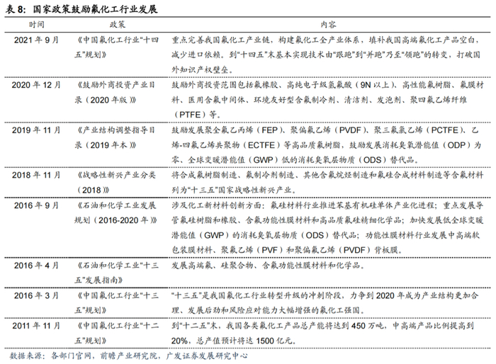 氟化工行业的价值重心在中下游,含氟产品加工深度的递增,其价值也会随之增加,其中氟精细化工品的附加值最高,为基准的500-5000倍,国内氟化工行业也逐步往氟精细化工品发展。“十二五”期间,国家已敲定萤石资源整合大体框架,并正式推进萤石资源整合,主要针对两个方面,一是改善优质氟资源过度开发的情况并对其进行保护;二是推进氟化工产业转型和升级,其中重点发展领域包括含氟聚合物、含氟电子化学品、含氟表活性剂、低GWP值的新型ODS的替代品领域。“十三五”是我国氟化工行业转型升级的冲刺阶段,氟化工行业要“由大变强”,缩小与国际先进水平的差距。“十四五”的目标是让氟化工行业朝高端化、高质化、精细化、高附加值、新用途品种方向发展。